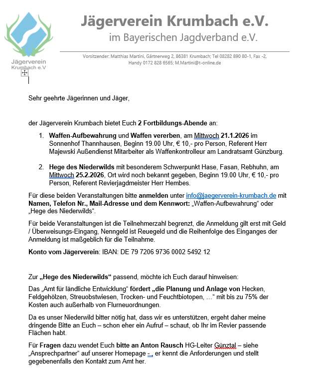 bitte beachtet folgende Information zu Veranstaltungen des Jägerverein Krumbach.